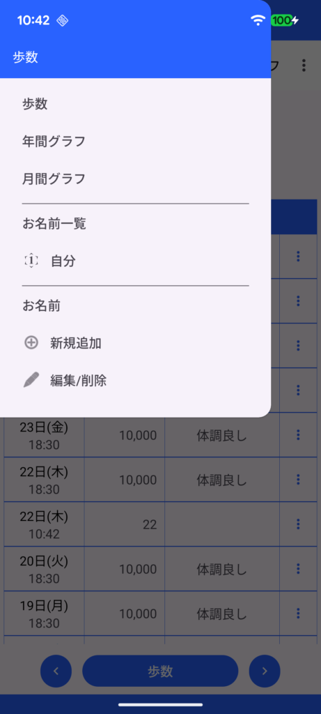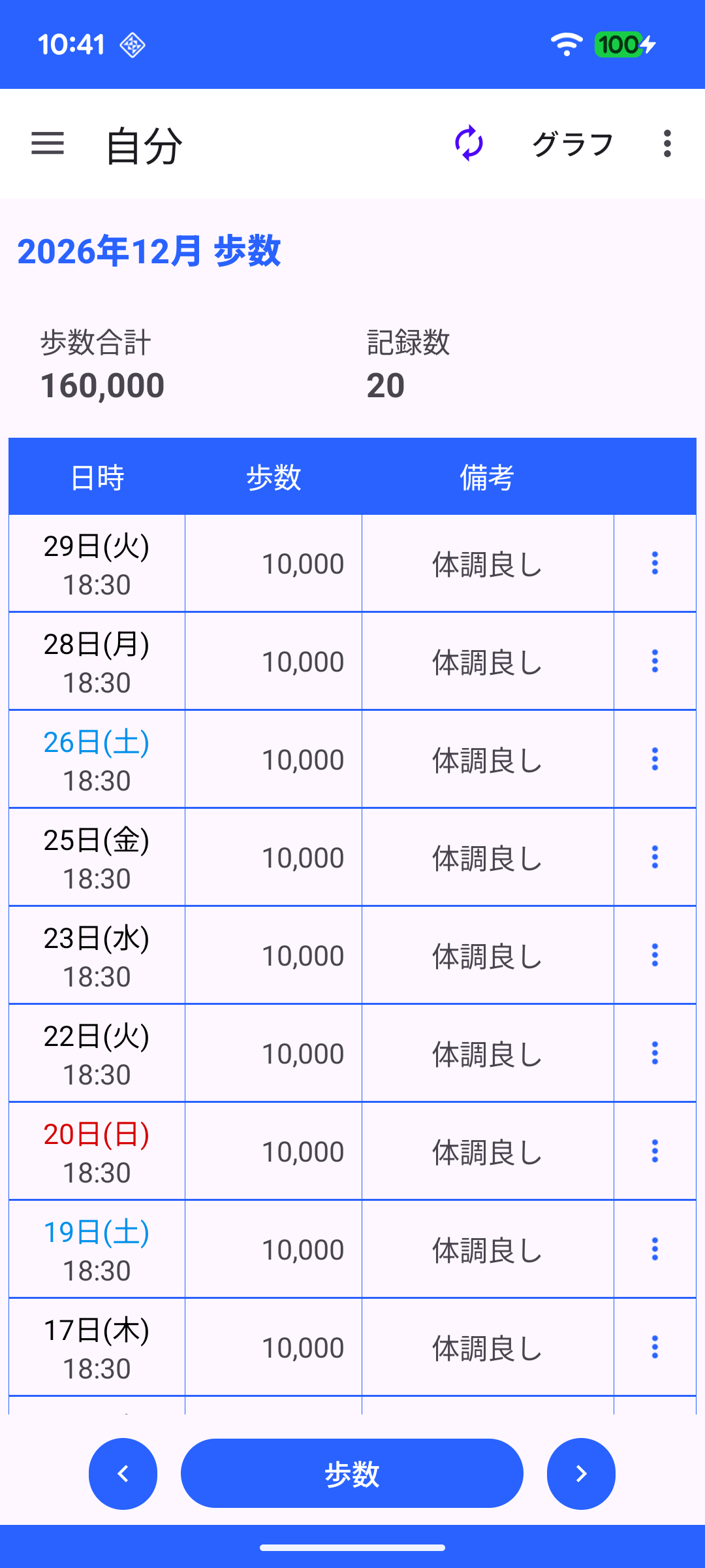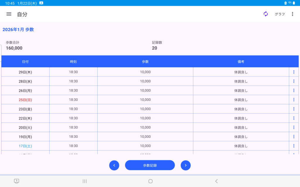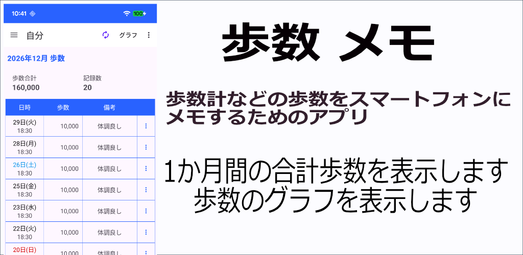 歩数 メモ 歩いた歩数と日時と備考を記録するためのアプリです 歩数計などの歩数をスマートフォンにメモするためのアプリです。歩数を記録すると、1か月間の合計歩数を表示します。歩数はグラフで確認できます。 歩数 メモはGoogle playでインストールできます 歩数 メモ Top画面 歩数 メモ 年月日選択画面 歩数 メモ 歩数 入力画面 歩数 メモ メニュー画面 歩数 メモ タブレット横画面 歩数 メモはGoogle playでインストールできます